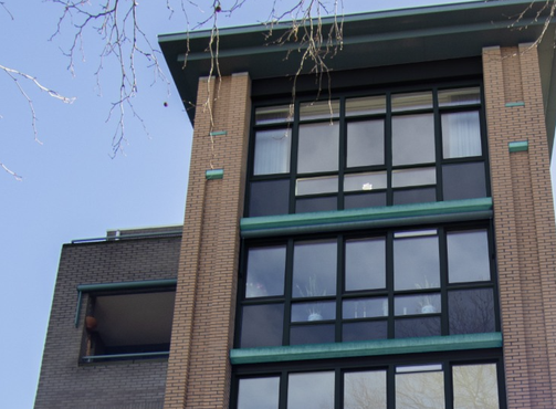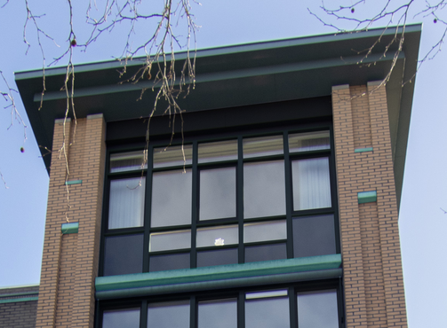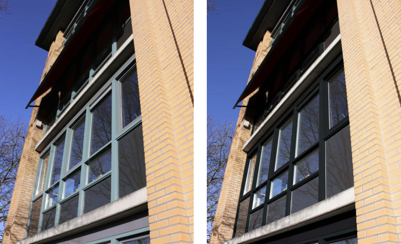 Door het beton in de zelfde kleur van het dak te doen (gecorrodeerd koper kleur) en het weg laten van de wit en lichte grijstinten. is het nu een krachtig gebouw geworden. Een ander voordeel is dat er al mensen zijn die de zonwering al op deze kleur (RAL 6033) hebben.